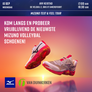 Nieuwe sportschoenen nodig? Kom woensdag 10 september Mizuno volleybalschoenen uitproberen! Van Duinkerken neemt de nieuwste modellen mee naar de Amerena, zodat je op je gemak kunt proberen. Save the date: 10 september, 17:00 - 19:30 uur, Amerena!
