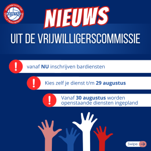 Vanaf 30 augustus zullen alle openstaande diensten verdeeld worden onder de teams die hun punten nog niet hebben behaald. Deze diensten worden uiterlijk 5 september gecommuniceerd naar het desbetreffende team. Zorg ook dan er weer voor dat diegene die de taak op zich neemt, zich inschrijft in de ClubApp zodat hij/zij ook de vrijwilligerspunten krijgt.