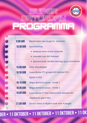 Volgende week zaterdag 17 januari is het weer Super Saturday. Een volle dag met mooie wedstrijden natuurlijk. Maar het is natuurlijk niet zomaar een Super Saturday, want AVV Keistad viert dit jaar het 25 -jarig bestaan. Dus is er taart voor de Volley Stars en de jeugd (in de ochtend)!! En het wordt een traditie: samen eten! En de avond wordt afgesloten met karaoke. Bekijk het programma en vergeet vooral ook niet om je eten te bestellen.
