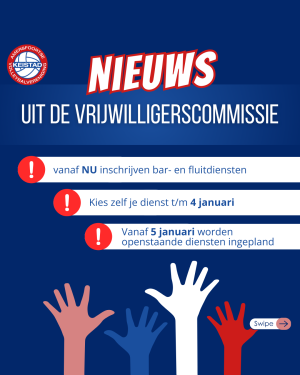 De Vrijwilligerscommissie heeft de afgelopen weken een flinke puzzel achter de rug om alle diensten te plannen. Goed nieuws: de bardiensten raken lekker gevuld! Nu nog wat extra aandacht voor fluitdiensten gevraagd.